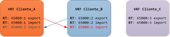 ! ip vrf Cliente_A rd 65000:1 route-target export 65000:1 route-target import 65000:1 route-target import 65000:2 ! ip vrf Cliente_B rd 65000:2 route-target export 65000:2 route-target import 65000:2 route-target import 65000:1 ! ip vrf Cliente_C rd 65000:3 route-target export 65000:3 route-target import 65000:3 !