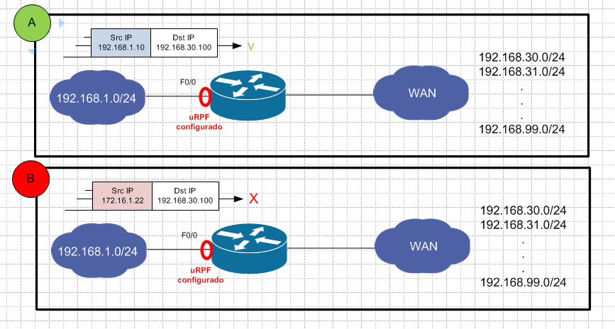 A feature uRPF compara o endereço IP de origem do cabeçalho IP com a tabela de rotas, com o objetivo de descartar pacotes que não possuem uma referência de rotas em determinada interface. Em resumo, o roteador só encaminhará o pacote, se o endereço IP de origem inserido no cabeçalho for acessível por aquela interface de entrada.
