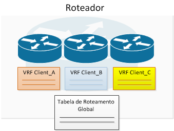 A utilização de VRFs (Virtual Routing and Forwarding) em Roteadores permite a criação de tabelas de roteamento virtuais que trabalham de forma independente da tabela de roteamento “normal”, protegendo os processos de roteamento de cada cliente de forma individual.