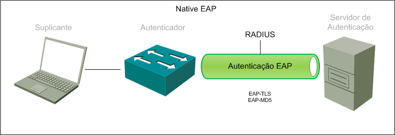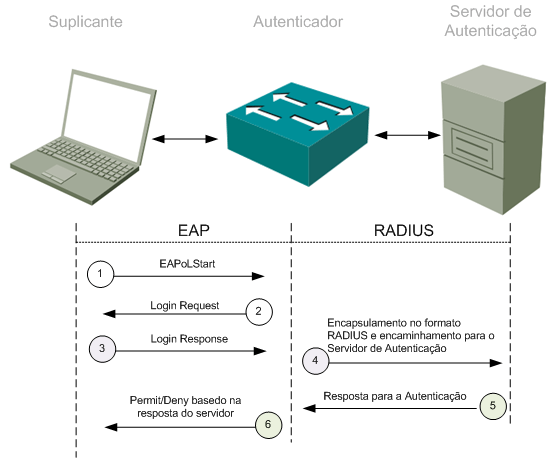 O padrão 802.1x descreve como as mensagens EAP são encaminhadas entre um suplicante (dispositivo final, como um host da rede) e o autenticador (Switch ou access point), entre o autenticador e o servidor de autenticação. O autenticador encaminha as informações EAP para o servidor de autenticação pelo protocolo RADIUS.