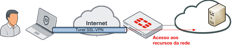 • SSL-VPN Tunnel Mode: Oferece suporte a grande maioria dos protocolos, mas requer a instalação de um software cliente VPN, um virtual network adapter, que pode ser utilizado com o FortiClient ou o módulo FortiSSL-VPN client.