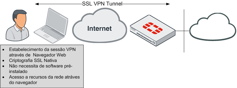 A solução de VPN quando baseada em SSL, oferece conectividade a determinados recursos internos da empresa, através de acesso remoto por um computador conectado a Internet, através de um software cliente ou um navegador web com criptografia SSL nativa.