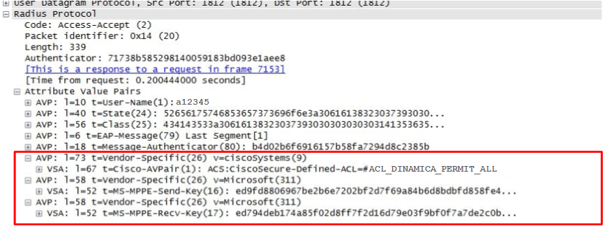Pulando já para o processo final de autenticação, se o ‘username’ é encontrado na base de dados e a senha é autenticada, o servidor RADIUS retornará a mensagem Access-Accept para o cliente. O Access-Accept carrega a lista de AV pairs que descrevem os parâmetros usados para a sessão. Os atributos podem incluir informações padrão como service-type (Shell ou Framed), protocol type, o IP do cliente, etc; como podem também conter os vendors-specific attributes (Attribute 26).