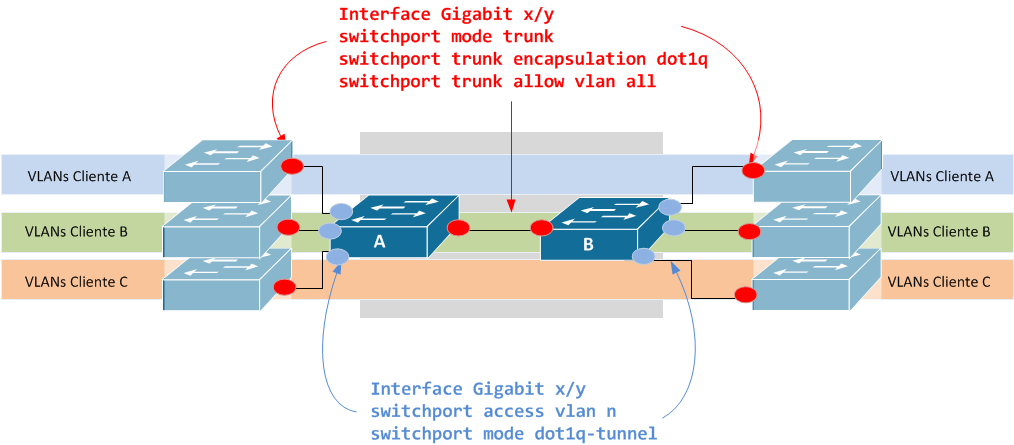 No Exemplo acima, com Switches Cisco, para o tráfego ser “tunelado” com a TAG adicional, devemos configurar os Switches A e B com uma VLAN para cada cliente , a configuração das interfaces conectadas aos Switches também deverão usar o comando “switchport mode do1q-tunnel”.