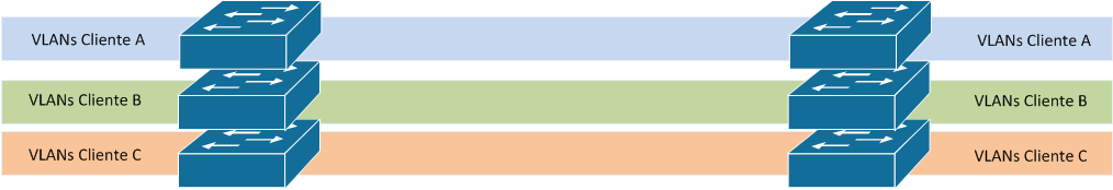 A configuração dos Switches de cada cliente, nessa topologia, não sofre nenhuma alteração em particular; e a visão de cada cliente  será  como se os Switches estivessem diretamente conectados.