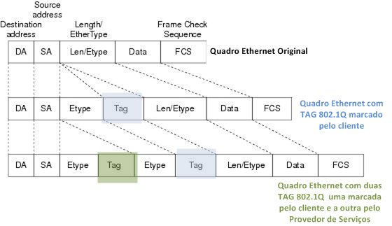 Em resumo, o tráfego no sentido de entrada na porta configurada com QinQ adicionará uma TAG 802.1Q ao quadro (TAG da Operadora/Provedor), mesmo em casos que já houver a marcação de VLANs, entretanto no sentido de saída, é removido apenas a última TAG acrescentada, sendo mantida a TAG 802.1Q inserida pelo cliente.