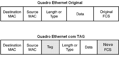 A marcação efetuada (chamada de TAG) adiciona aos quadros Ethernet 4 bytes no frame original e calculam um novo valor de checagem de erro para o campo FCS.